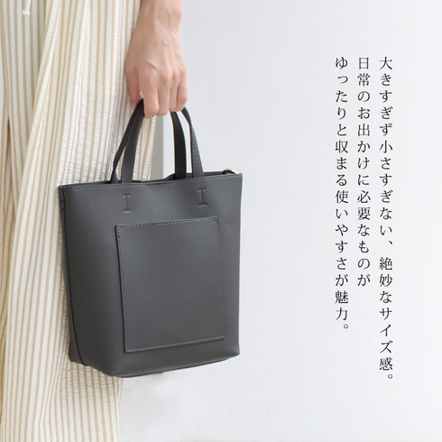シンプルで飽きのこない縦長のトートデザインでどんなシーンにもマッチ。