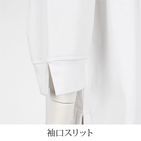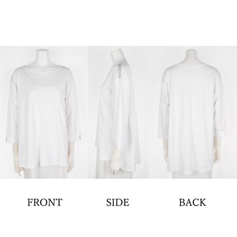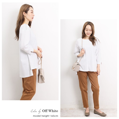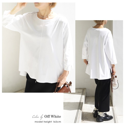 七分袖で抜け感をプラスし、前後差がある裾で体型カバーも◎。