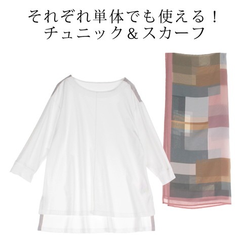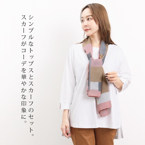 顔周りがパッと華やぐ取り外し可能なスカーフ付きトップスです。