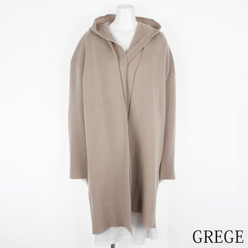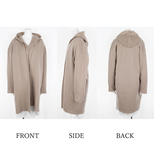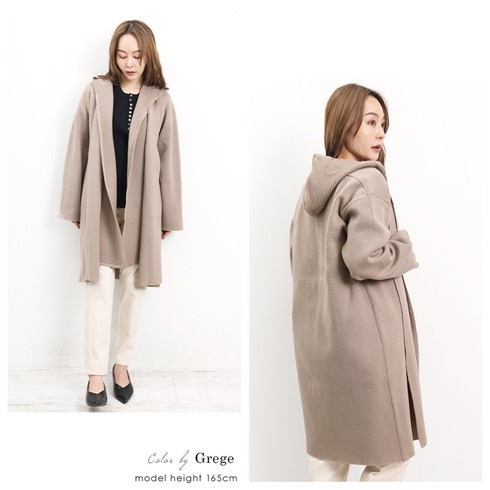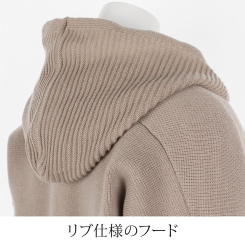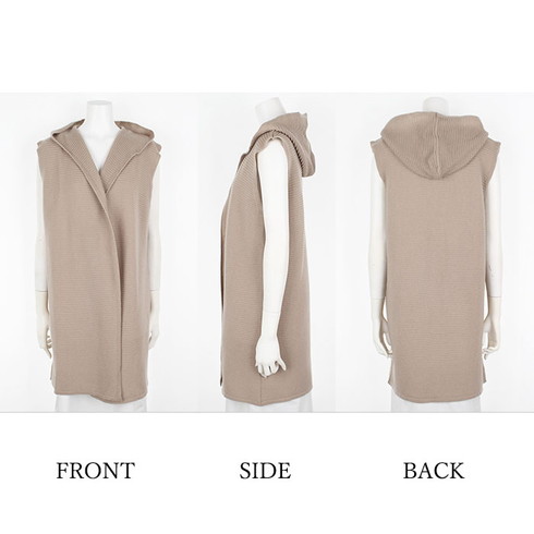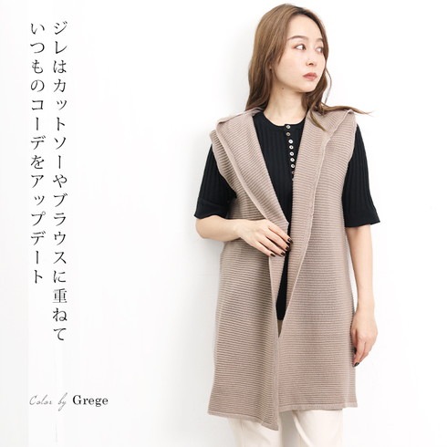フード付きジレはすっきりと縦長のシルエットでスタイルアップ効果◎。