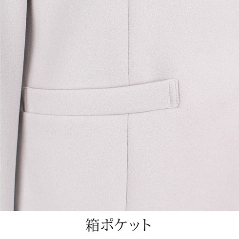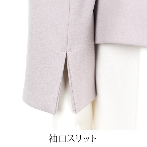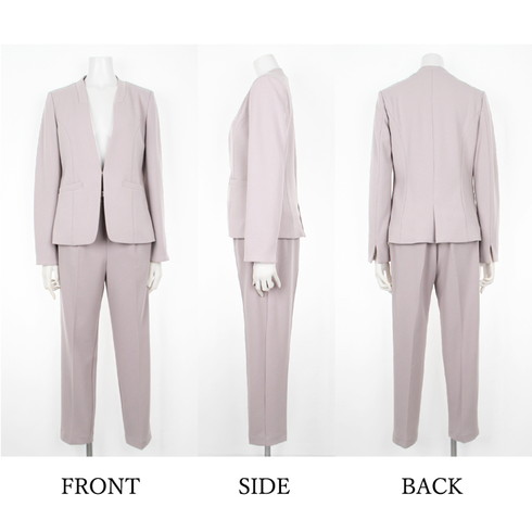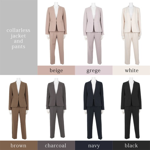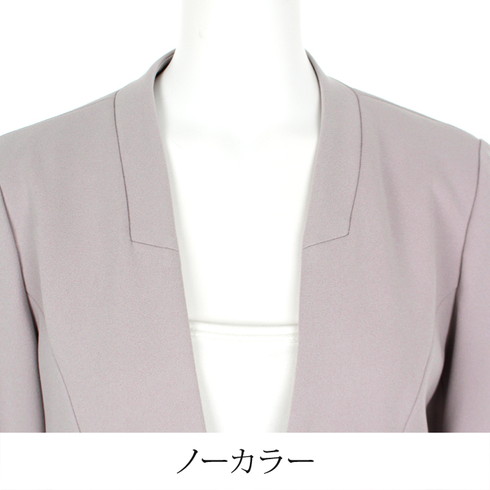 ジャケットはネックラインが綺麗に見えるノーカラーですっきりとした印象。