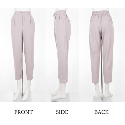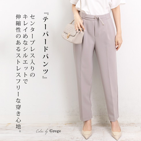 センタープレス入りのテーパードパンツはゴールドのDカンをあしらったベルト付き。