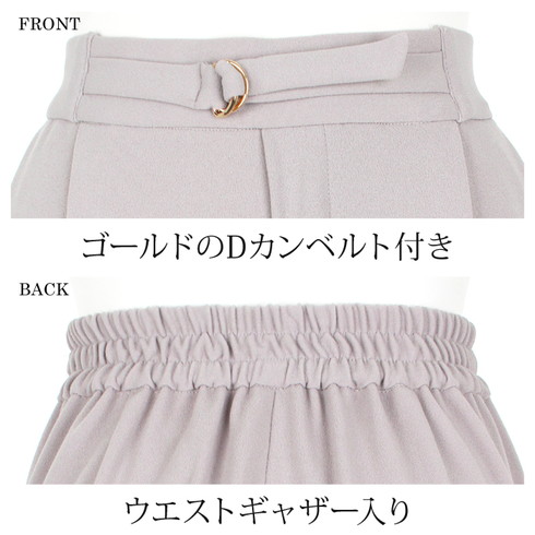 センタープレス入りのテーパードパンツはゴールドのDカンをあしらったベルト付き。