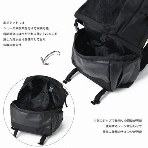 底ポケットは水や汚れに強いPVC加工なので濡れた服でもOK。