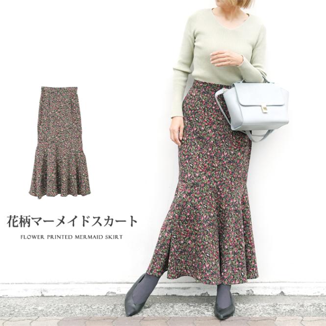 フラワーマーメイドスカート♪膝下 ロング丈 レディース 花柄 マーメイド マキシ丈 マキシスカート ロングスカート ボトムス フレアスカート ナチュラル ブラック[5778]